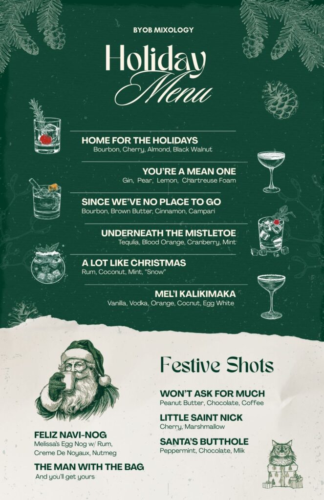 This year, we’re shaking things up with a cocktail menu inspired entirely by classic Christmas songs. Each drink pays tribute to a holiday tune you know and love—crafted with seasonal flavors, whimsy, and a little festive mischief. Come sip the soundtrack of the season.